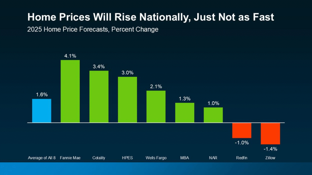 Whether you’re buying, selling, or thinking about doing both, this market requires strategy, not guesswork. Prices are still rising nationally (just more slowly), and rates are projected to stay pretty much where they are, so the bigger picture is one of moderation – not a meltdown.